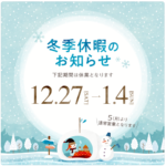 年末年始休業期間:12/27(土)~1/4(日) 5日(月)より通常営業となります。